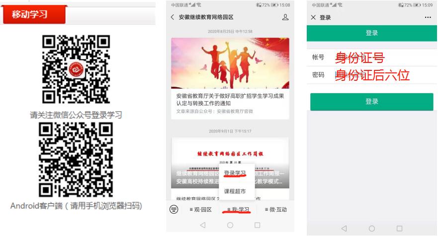 2、手机端登录:手机微信关注“安徽继续教育网络园区”公众号,选择“我学习”--“登录学习”登录,账号:本人身份证号码,密码:身份证后六位(末位为X的需大写,不建议修改密码)。