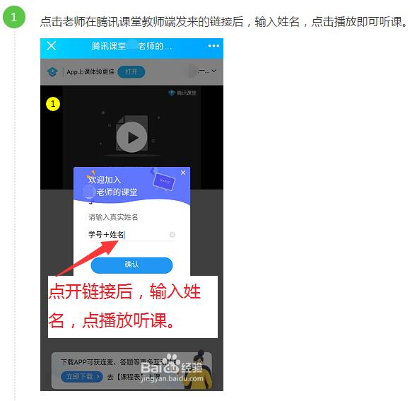 2、手机端登录:手机打开“腾讯课堂”课程链接(关注班级群通知),首次登录需更改昵称:学号+姓名,点击播放即可听课。