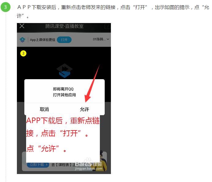 4、APP下载安装后,重新点击老师发来的链接,点击“打开”,出现如图的提升,点“允许”。